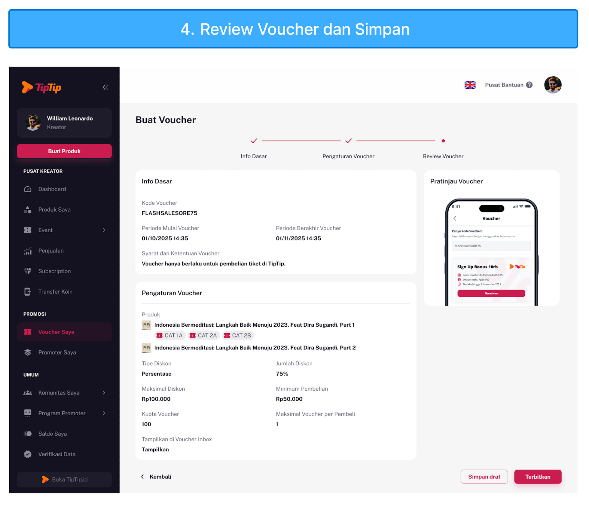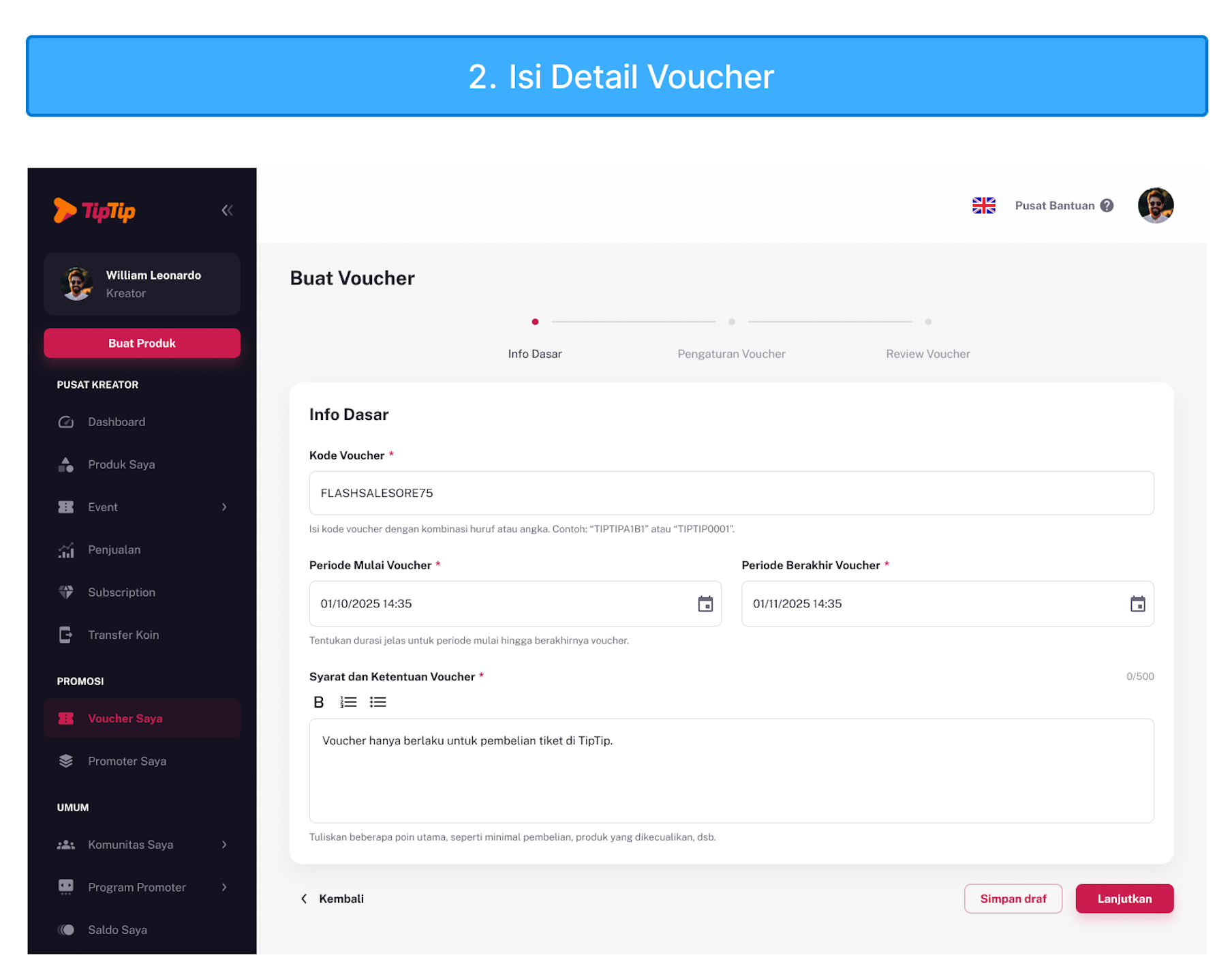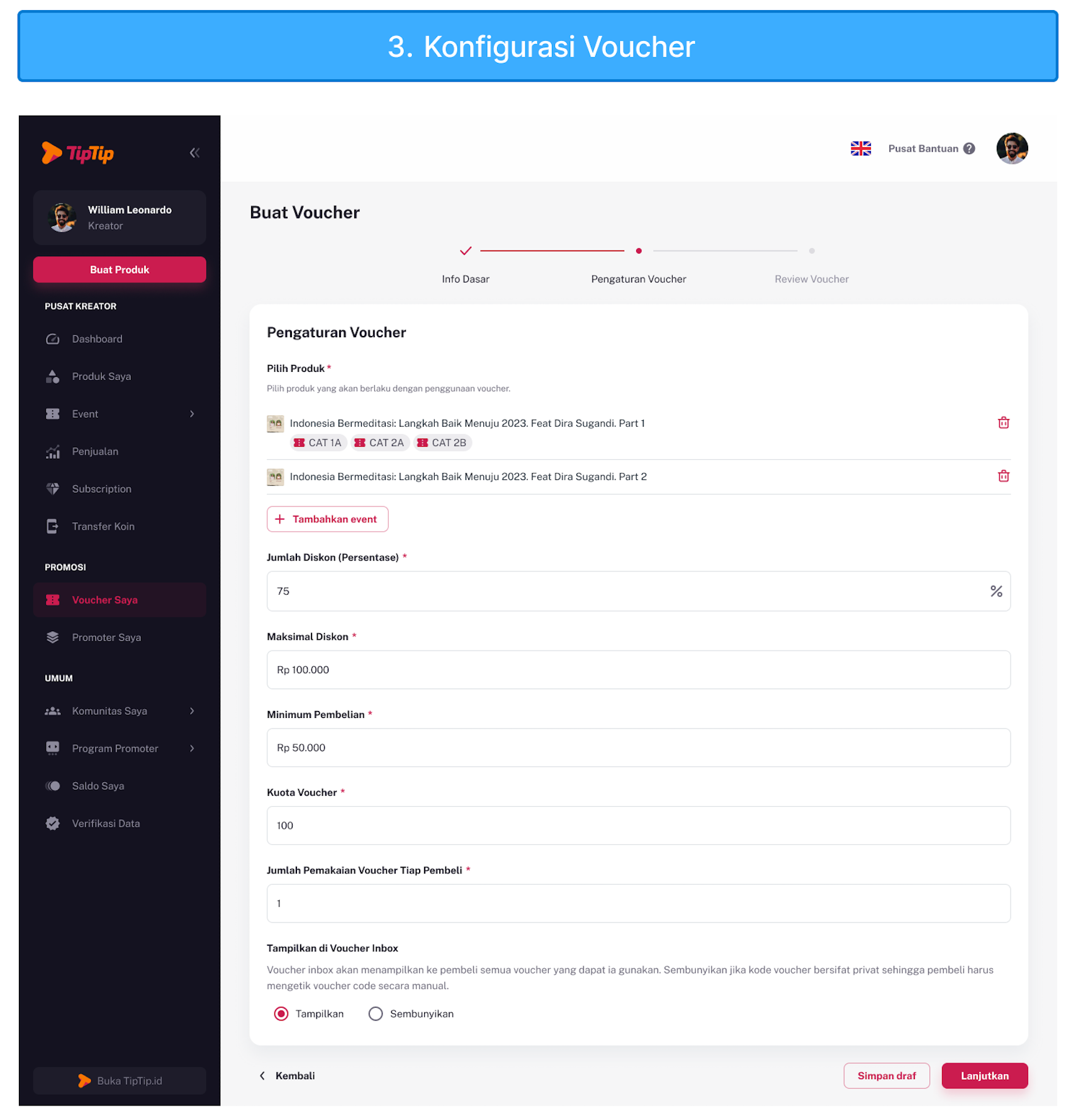 Di halaman kedua, user dapat mengkonfigurasi voucher, seperti event atau kategori tiket mana saja yang berlaku, nominal diskon voucher, jumlah potongan max diskon, kuota voucher dan jumlah pemakaian voucher tiap pembeli