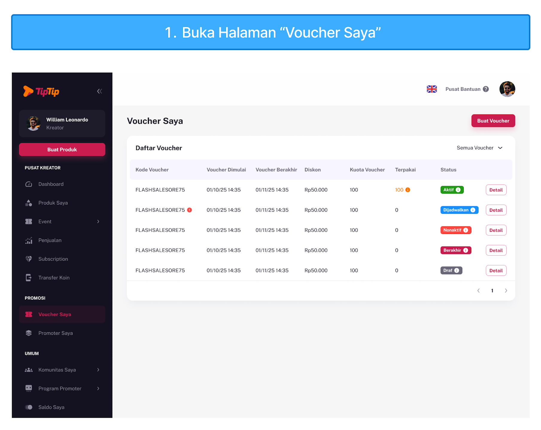 Menu ini akan memperlihatkan semua daftar voucher berdasarkan statusnya (draft, dijadwalkan, aktif, berakhir, dan nonaktif)